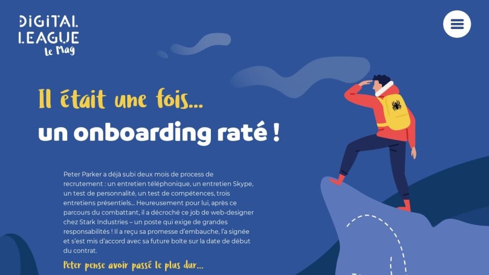 recrutement : un entretien téléphonique, un entretien Skype, un test de personnalité, un test de compétences, trois entretiens présentiels… Heureusement pour lui, après ce parcours du combattant, il a décroché ce job de web-designer chez Stark Industries – un poste qui exige de grandes responsabilités ! Il a reçu sa promesse d’embauche, l’a signée et s’est mis d’accord avec sa future boîte sur la date de début du contrat.